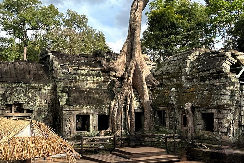 Ta Prohm ( Jungle Temple ) massive fig and Silk-cotton trees grow from the Towers and Corridors offering a Jungle atmosphere, photo opportunities there. Ta Prohm is still well worth an extended exploration of its dark corridors and open plazas. This temple was one of Jayavarman VII’s first major temple project and dedicated to his mother.